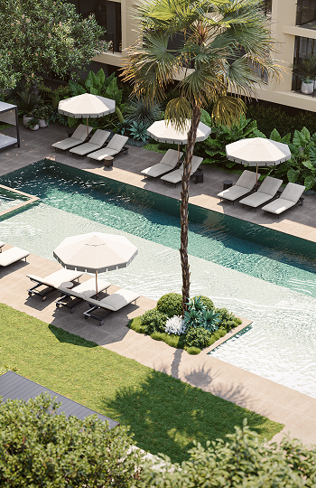 With approximately one acre of landscaped gardens and shared amenities, the Garden Club at Florian Rise addresses a vital lifestyle need by crafting environments that nurture our innate connection to the world around us. Comprising walking paths, an expansive multi-purpose lawn, a pool, lounges, and sheltered outdoor pavilions for gathering and entertainment, the Garden Club maintains a resilient, community-focused lifestyle that transcends typical apartment amenities and creates a place of modern relevance.